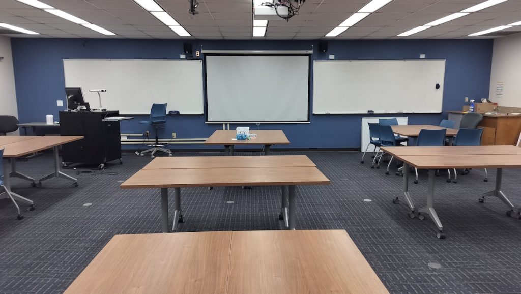 267 Teacher Education Bldg. Seating Capacity – 30 Laptop Inputs – HDMI, USB-C adapter In-room Computer – Dell PC Wireless head-worn microphone Videoconferencing – PTZ Camera, wireless mic Additional Inputs – Document Camera A/V System Instructions