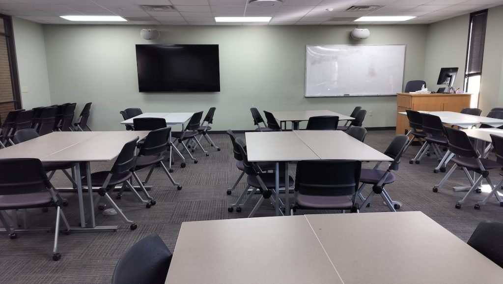 336 Teacher Education Bldg. Seating Capacity – 40 Laptop Inputs – HDMI, USB-C adapter In-room Computer – Dell PC Videoconferencing – PTZ camera, Ceiling microphones (2) A/V System Instructions